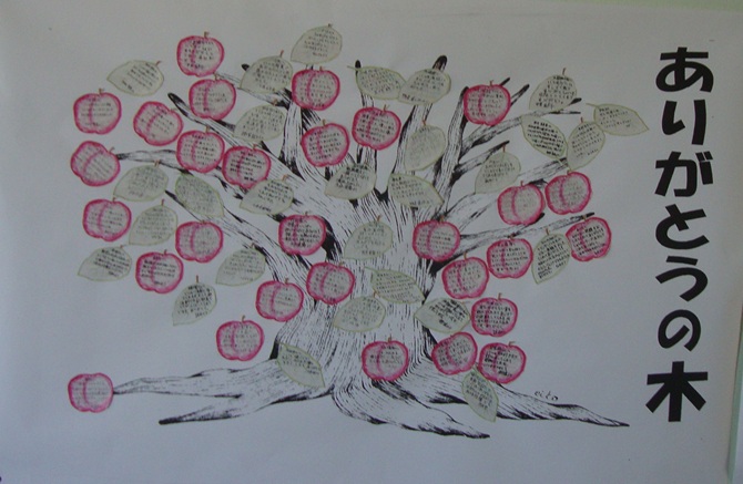 人権週間の成果として、各クラスでありがとうの木を作成しました。