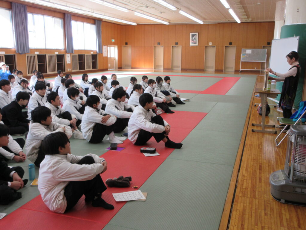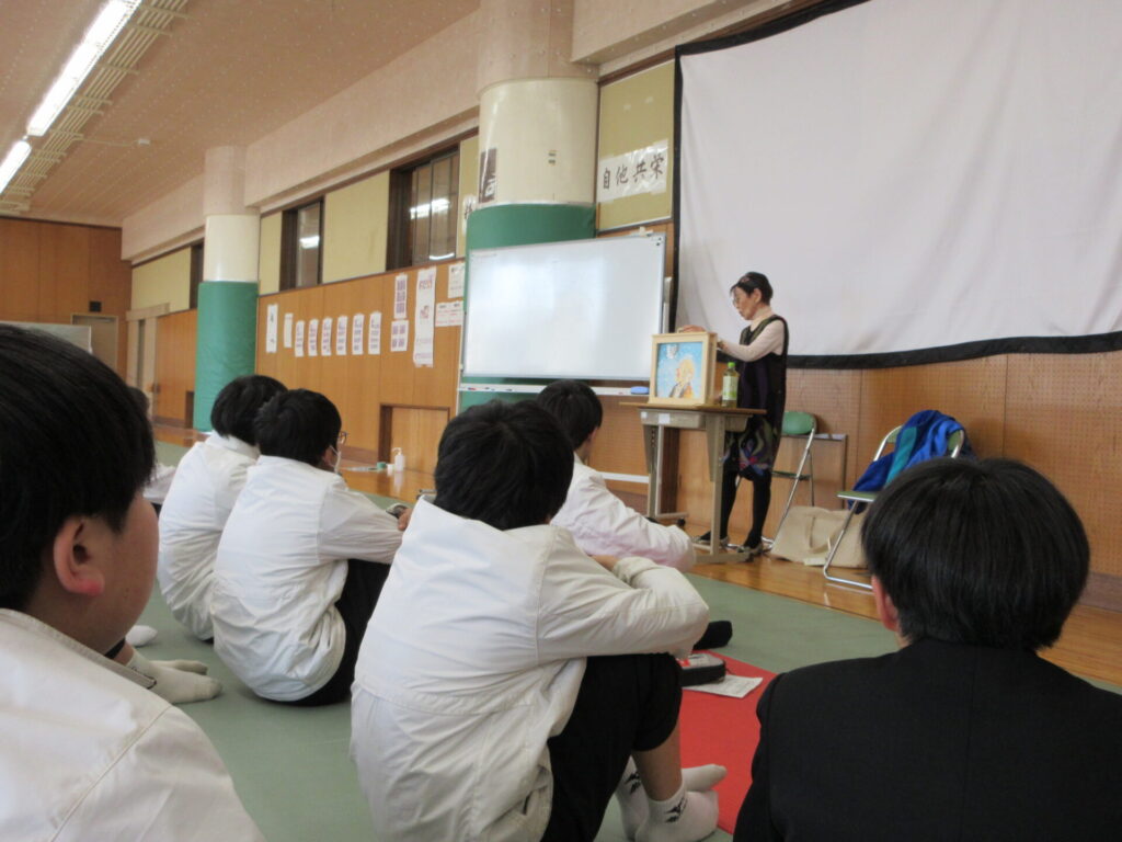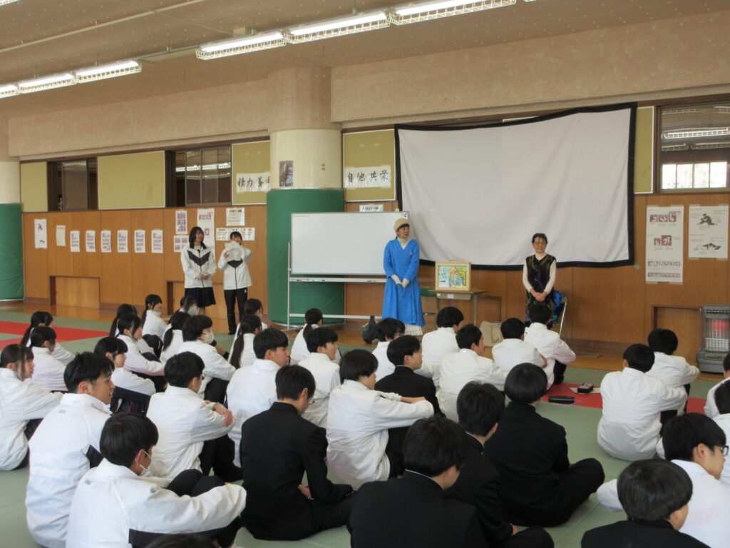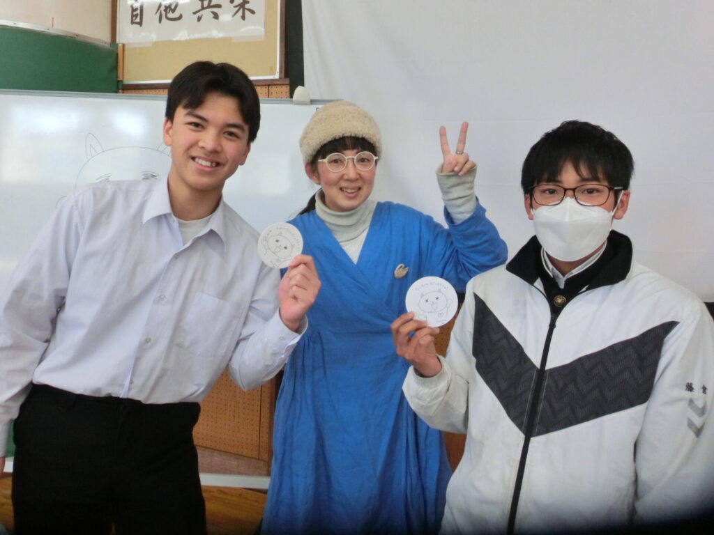 ニャオざねを描いたイラストレイターのことなさんと英語紙芝居を披露してくれた森さんの二人が妻沼西中学校へ来校し、生徒たちにイラストの描き方、英語ビンゴ、つるのおんがえしの読み聞かせなど、たくさんの交流をしました。
