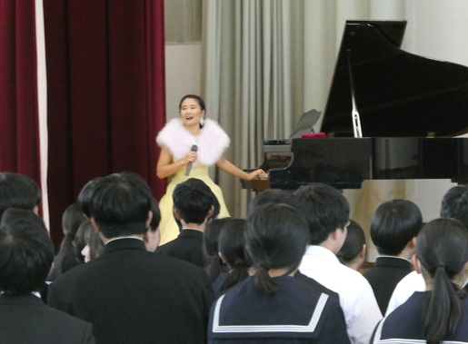 本校出身のオペラ歌手 岡崎麻奈未さんが来校し、母校の後輩たちに、美しい歌声を披露してくださいました。