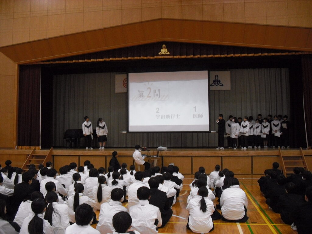 朝会の様子 2025年12月14日 最終更新日時 : 2025年12月14日 kumagaya_edit 放送委員会が朝会で日頃の取り組みやクイズを発表しました。放送委員さんのお昼の放送は、アドリブも入っていつも楽しみに聞かせてもらっています。これからも頑張ってくださいね!