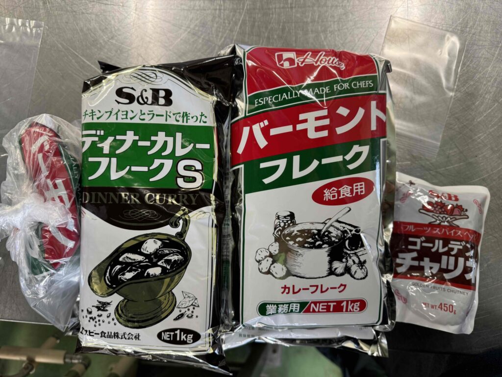 ④この日使われる7kgのカレー粉です。大さじで例えると700杯分あるそうです。隠し味のチャツネもビッグサイズですね。