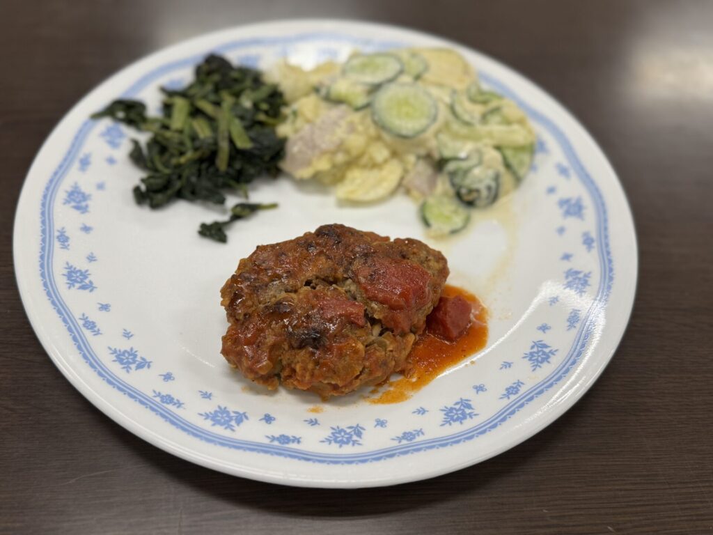 1年生が、技術・家庭(家庭分野)の授業で調理実習を行いました。メニューは、「ハンバーグ、ポテトサラダ、ほうれん草のソテー」です。中学生は、生肉や生魚を使った料理をするようになります。みなさん、手際よく調理をしていました。きゅうりは、同じ暑さに切ることができていました。是非、お家でも実践してほしいです。思い出に残る授業になったと思います。