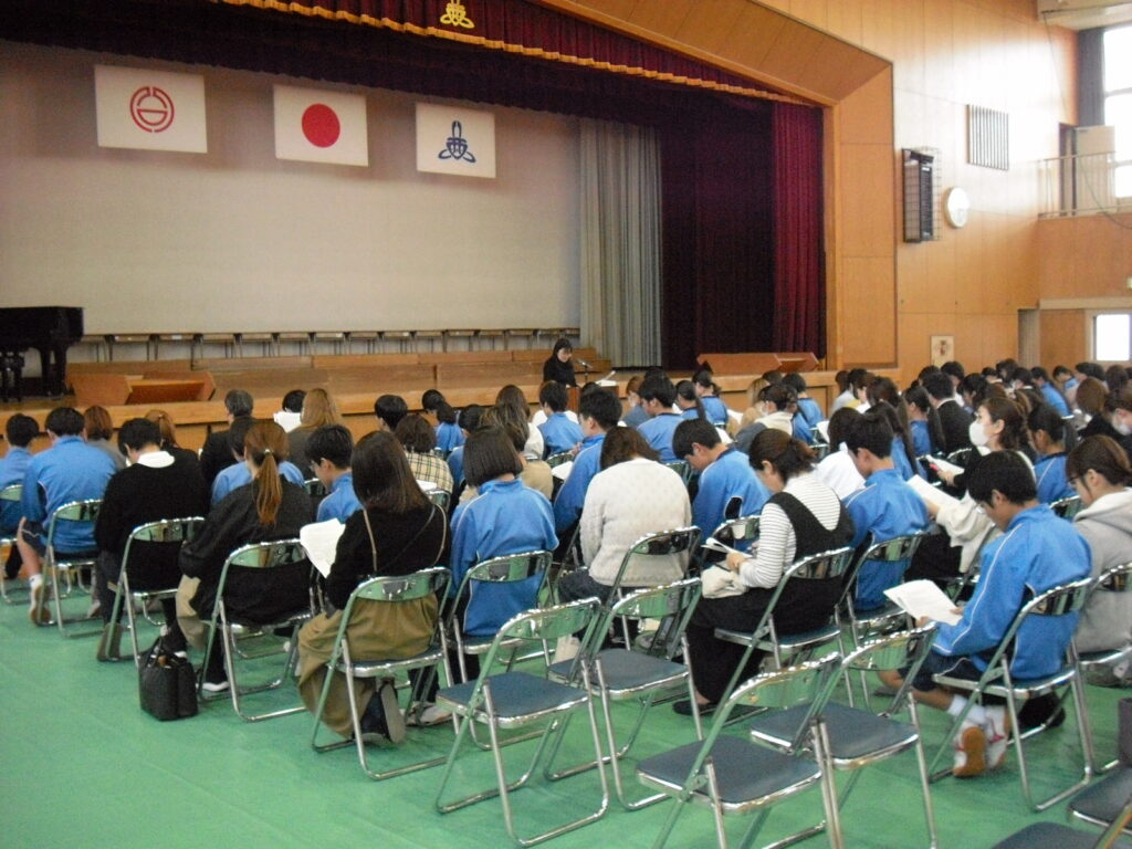 進説明会が開かれました。説明に真剣に耳を傾け、進路について考えていました。