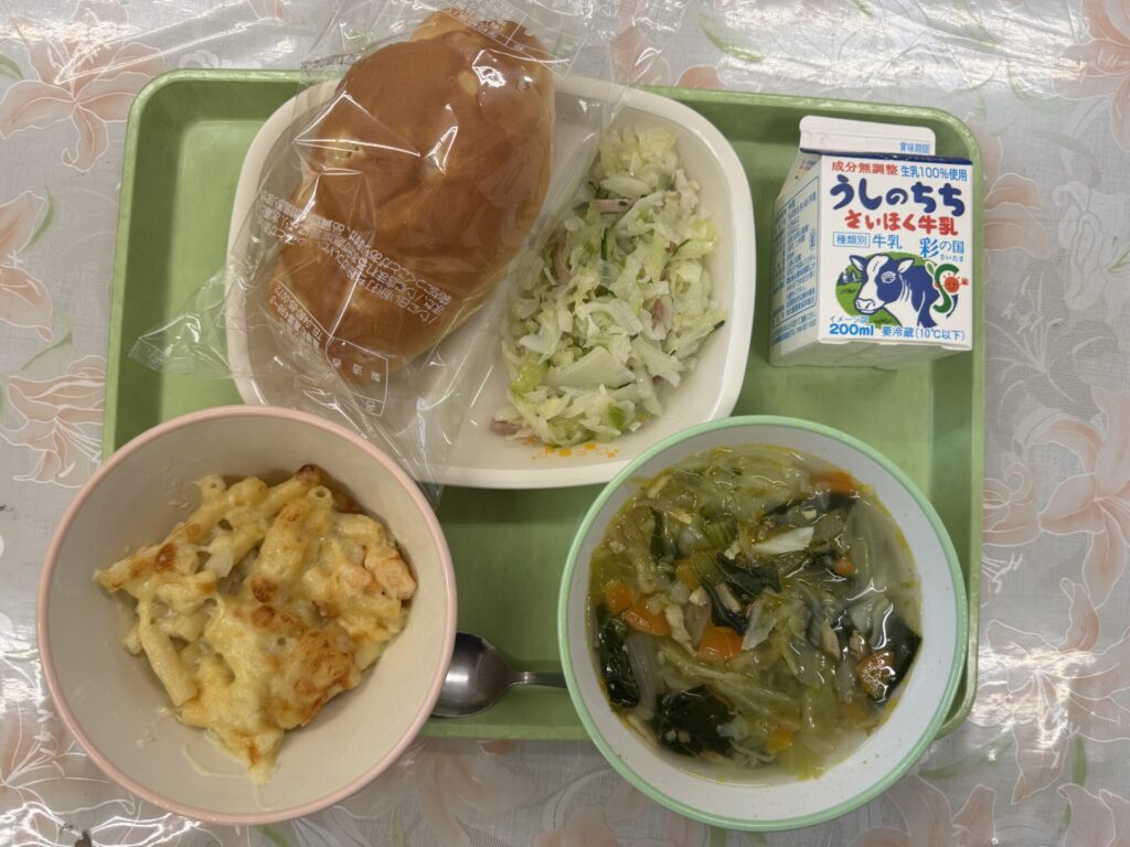 今日の給食は、パインパン、マカロニグラタン、ハムキャベツサラダ、カレー風味スープ、牛乳です。みなさん、マカロニグラタンは好きですか。グラタンのソースは、ホワイトソースというソースとマカロニを和えてつくります。ホワイトソースは、小麦粉、バターを炒めながら混ぜて、そこに牛乳を入れて作ります。ここでクイズです!ホワイトソースと鶏肉、じゃがいも、にんじん、玉ねぎを煮込むと何ができるでしょうか。正解は・・・シチューです。ホワイトソースは、いろいろな食材と組み合わせることで、様々な料理を作ることができます。今日も味わって給食を食べてくださいね!