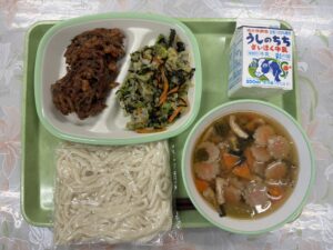 今日の給食は、地粉うどん、えんむちゃんうどん汁、ひじきと大豆のかき揚げ、磯の香和え、牛乳です。妻沼西中学校の調理室で作られるかき揚げは、調理員さんが1つ1つ手作業で揚げています。冷凍食品を使う学校が多いですが、調理員さんが愛情を込めて調理してくれています。調理員さんに感謝して味わって食べてくださいね。
