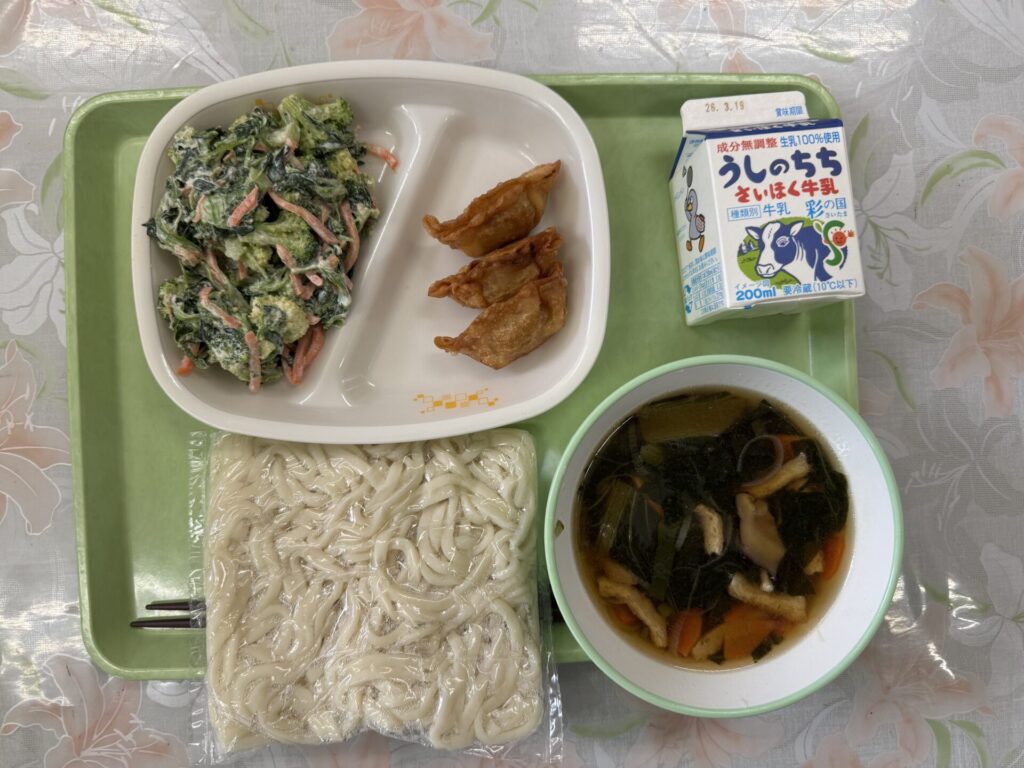今日の給食は、地粉うどん、えんむちゃんうどん汁、揚げ餃子、冬野菜のごまマヨネーズ和え、カスタードプディング、牛乳です。今日は餃子のお話です。日本で一番餃子を食べている都市はどこだと思いますか。答えは、静岡県浜松市です。3年連続の1位とのことです。餃子のまちとして有名な宇都宮市は、2位だったそうです。日本人にもおなじみの餃子。みなさんは、年間どれぐらい餃子を食べますか。揚げ餃子を味わって食べてみてくださいね。