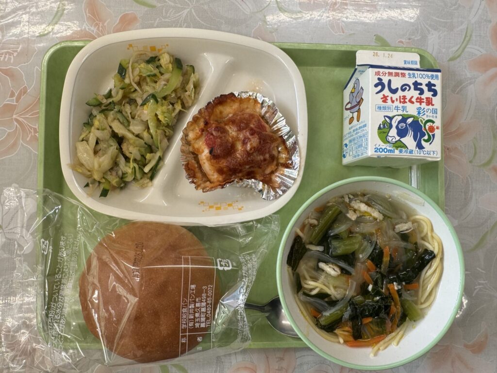 今日の給食は、こどもパン、チキントマトチーズ焼き、コンソメスープスパゲッティ、ヘルシーサラダ、牛乳です。チキントマトチーズ焼きのおいしさの秘密を知っていますか。これは、鶏肉のうまみ成分であるイノシン酸とトマトのうまみ成分であるグルタミン酸が味の相乗効果を生み出しています。少し難しいお話でしたが、高校の家庭科で勉強しますので、是非覚えておいてください。うま味の詰まったチキントマトチーズ焼きを味わってくださいね。