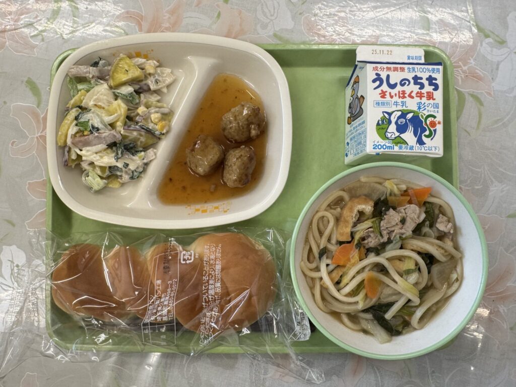 今日の給食は、ツイストパン、熊谷うどん、彩の国サラダ、ミートボールの甘辛煮、牛乳です。みなさん、今週から「地場産物活用強化ウィーク」です。今日は熊谷や埼玉県にちなんだメニューが出ています。熊谷うどんは、熊谷産の小麦粉を使っためんが使われています。彩の国サラダには、埼玉県でたくさん栽培されているさつまいも、とうもろこし、にんじんなどが入っています。埼玉県の恵みに感謝して今日も味わって給食を食べてくださいね!