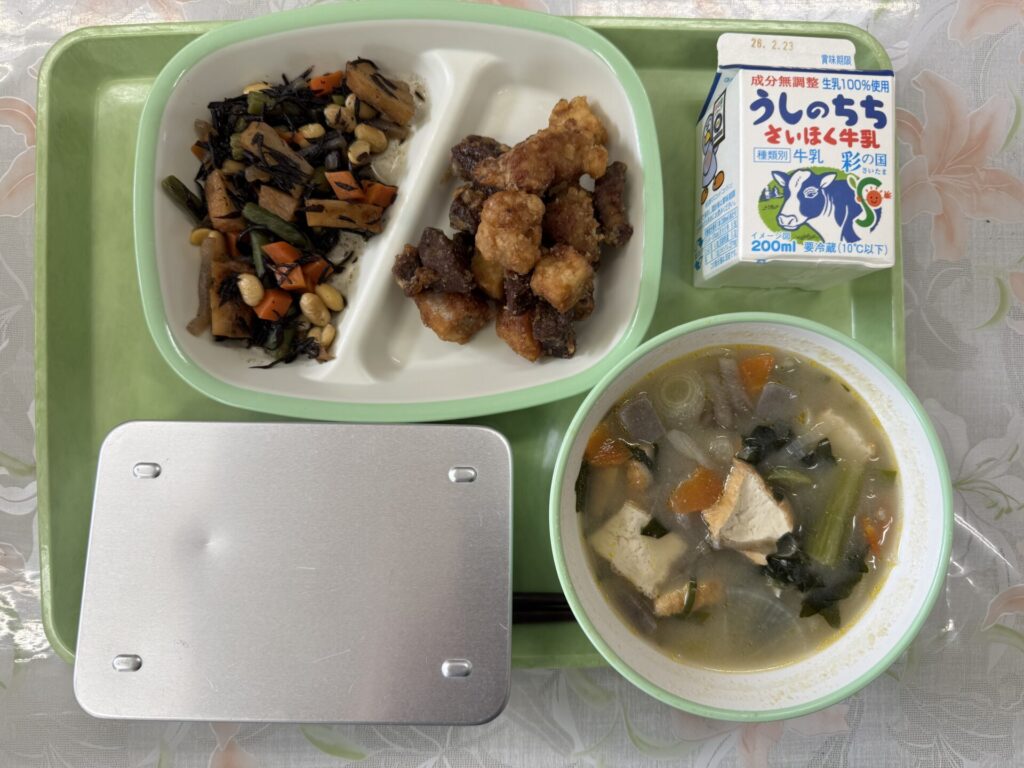 今日の給食は、ごはん、豚肉と高野豆腐のごまだれ、野菜椀、大豆の磯煮、牛乳です。今日は、ごまについてのお話です。ごまは、なんと縄文時代から食べられているそうです。そして奈良時代には栽培されていたそうです。ごまからごま油を作ったり、お菓子にしたりしていたそうです。ごまは、現在でも、和え物やお菓子など様々な料理に使われていますね。味わって食べてください。
