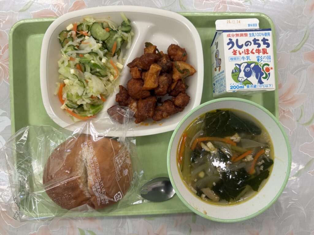 今日の給食は、さきたまライスボール、豚肉のマリアナソース、オニオンスープ、チーズサラダ、牛乳です。さきたまライスボールは、埼玉県産のお米を配合したパンです。ちょこっと砂糖がてっぺんに付いていて甘みがあっておいしいですね。米粉をパンにするのは難しい技術が必要で、最近ではふっくらおいしい米粉パンが作られるようになりました。普通のパンより少しもっちりした食感を味わってみてください。