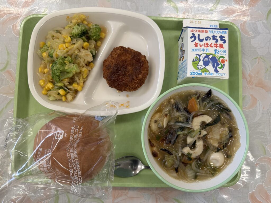 今日の給食は、コロッケバーガー、太平燕(タイピーエン)、コーンサラダ、チーズ、牛乳です。新メニュー太平燕は、熊本県のご当地グルメです。日本でアレンジされた中華料理の一つです。春雨スープに豚肉や野菜や卵を入れた料理です。最近では、学校給食でも提供されるようになりました。新メニューどんな味なのかよく味わって食べてくださいね。