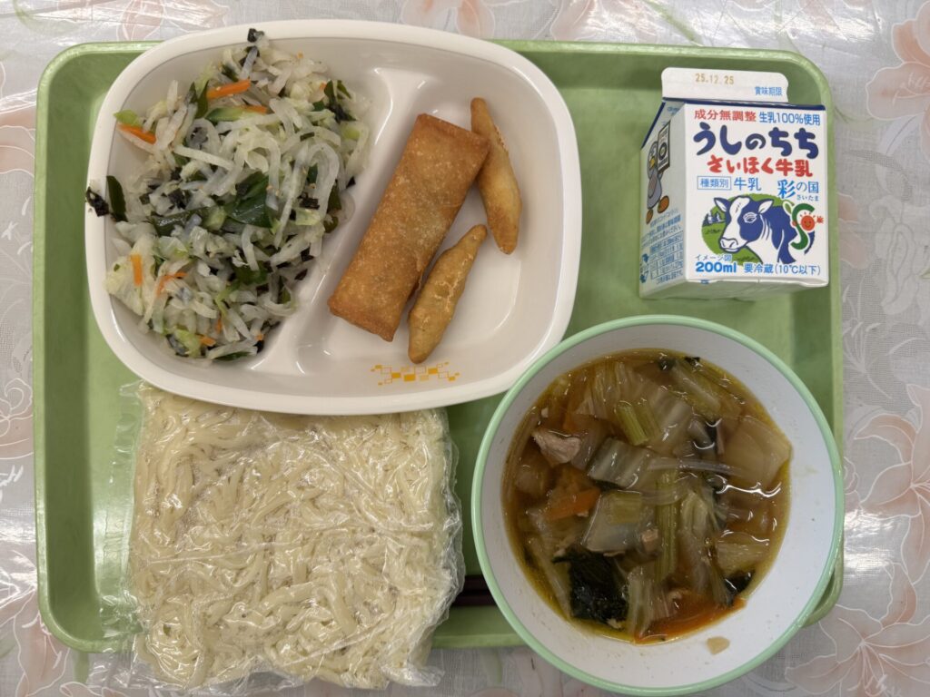 今日の給食は、ホット中華麺、うま煮ラーメンスープ、ミックスフライ、韓国風チョレギサラダ、牛乳です。今日は、韓国風チョレギサラダのチョレギは、韓国語で漬けるという意味で、韓国にチョレギサラダはありません。驚きですね。ドレッシングの商品名にチョレギが使われて広まったという説もあります。ごま油ベースの香りのよい韓国風チョレギサラダを味わって食べてくださいね。