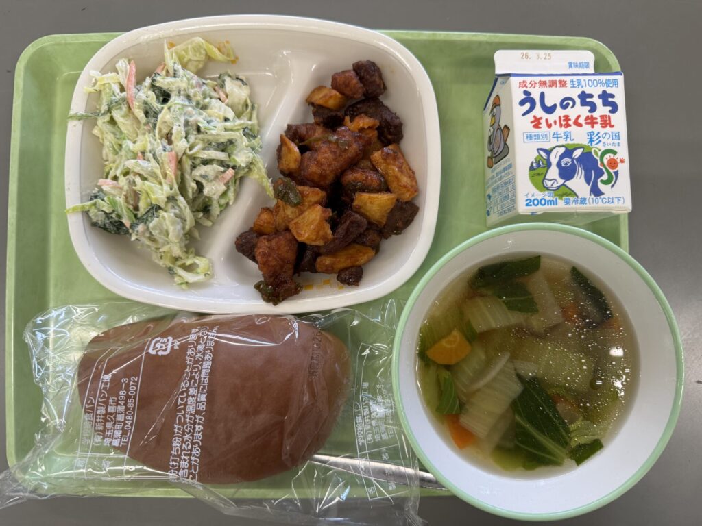 今日の給食は、黒パン、豚肉のマリアナソース、チンゲン菜のスープ、ほうれん草のサラダ、牛乳です。今日は令和7年度最後の給食です。暑い日も、寒い日も、みなさんのために美味しい給食を作ってくれた調理員さんのみなさんに感謝の気持ちを込めて食べましょう。また、火曜日と水曜日にご飯を用意してくれた家の人にも感謝の気持ちを伝えましょう。調理員のみなさん、家族のみんな1年間ありがとうございました。