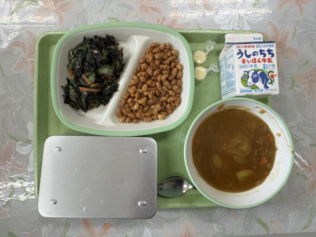今日の給食は、ごはん、ポークカレー、大豆のカリカリ揚げ、ほうれん草のサラダ、チーズでカルシウム、牛乳です。今日は、ほうれん草のお話です。ほうれん草は戦国時代の終わり頃に中国からきたとされています。緑黄色野菜の一つでビタミンやカルシウムが豊富に含まれている野菜です。今日はサラダにしました。味わって食べてくださいね。