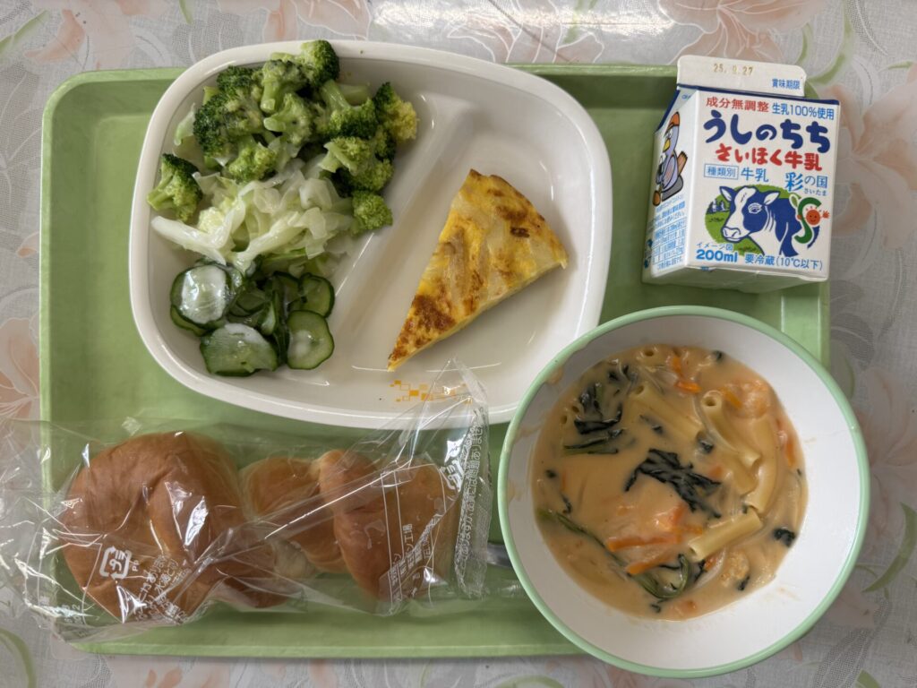 今日の給食は、ツイストパン、マカロニのヒリヒリ煮、アンサンブルエッグ、グリーンサラダ、牛乳です。アンサンブルエッグは、卵に、ジャガイモとチーズを入れて、スチームコンベンションオーブンで焼き上げたメニューです。ジャガイモが入ってボリュームもあり、チーズの旨味が溶け込んだ一品でした。