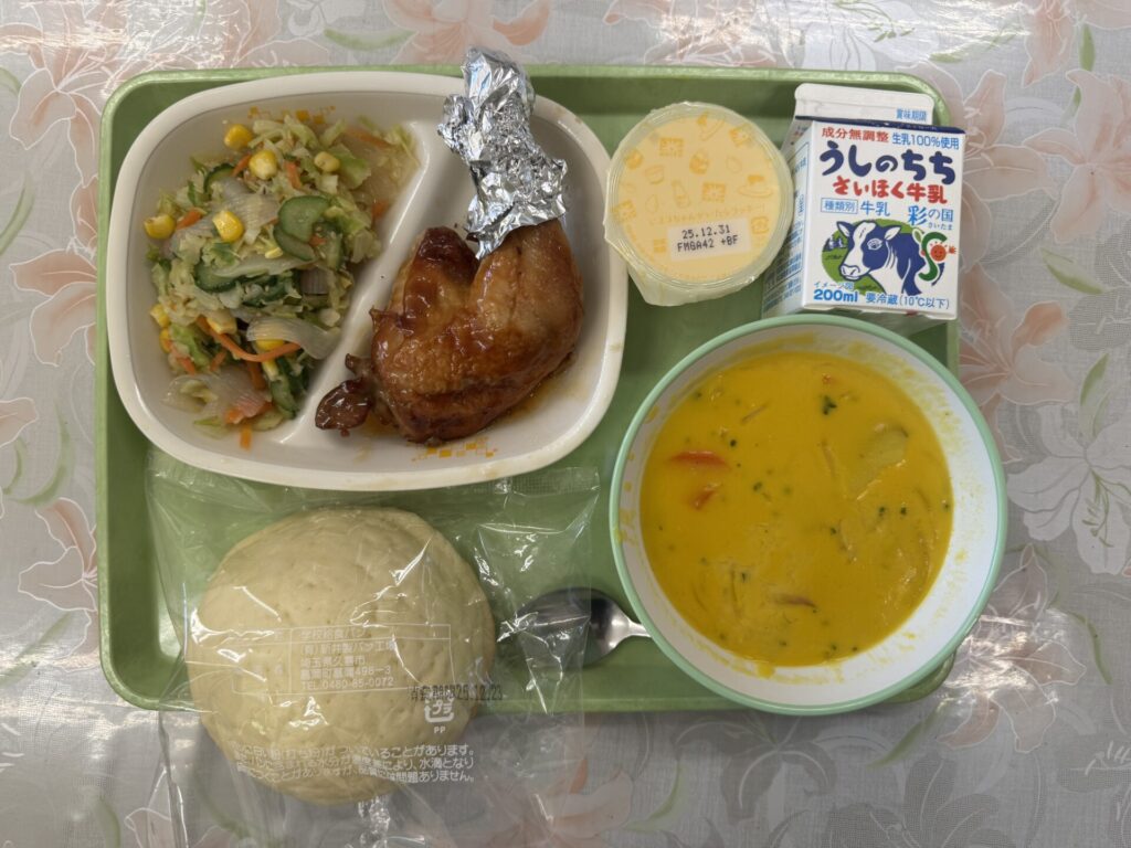 今日の給食は、スクールメロン、クリスマスチキン、こんにゃくサラダ、パンプキンポタージュ、カスタードプリン、牛乳です。クリスマスになぜチキンを食べるか知っていますか。それはアメリカの影響があると言われています。アメリカでは、クリスマスに七面鳥を食べます。日本では七面鳥がなかなか手に入らないため、手に入りやすいチキンが定着したと言われています。一本一本丁寧に調理員さんが焼いてくれたチキンを味わって食べてくださいね。