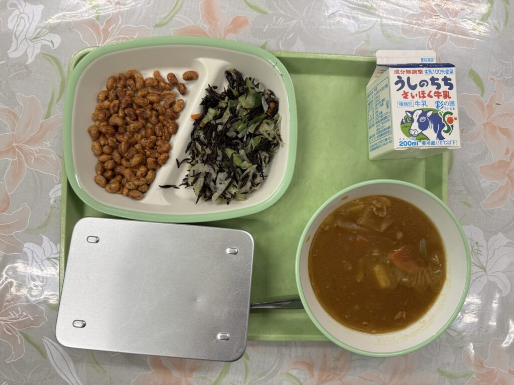 今日の給食は、ごはん、ポークカレー、大豆のカリカリ揚げ、ツナとひじきのサラダ、牛乳です。昨日のメニューのプリンのお話です。みなさん、カスタードで知っていますか。牛乳、卵黄、砂糖を熱しながら混ぜて作ります。火加減が強すぎると焦げてしまうので、調理が難しいです。カスダードは、生クリームと混ぜればシュークリームのクリームに、カスダードをそのままパン生地に包んで焼けばクリームパンに、カスダードを蒸すとプディングになります。上手にカスタードが作れればあなたもパティシエになれるかも。冬休み作ってみるのもいいですね。