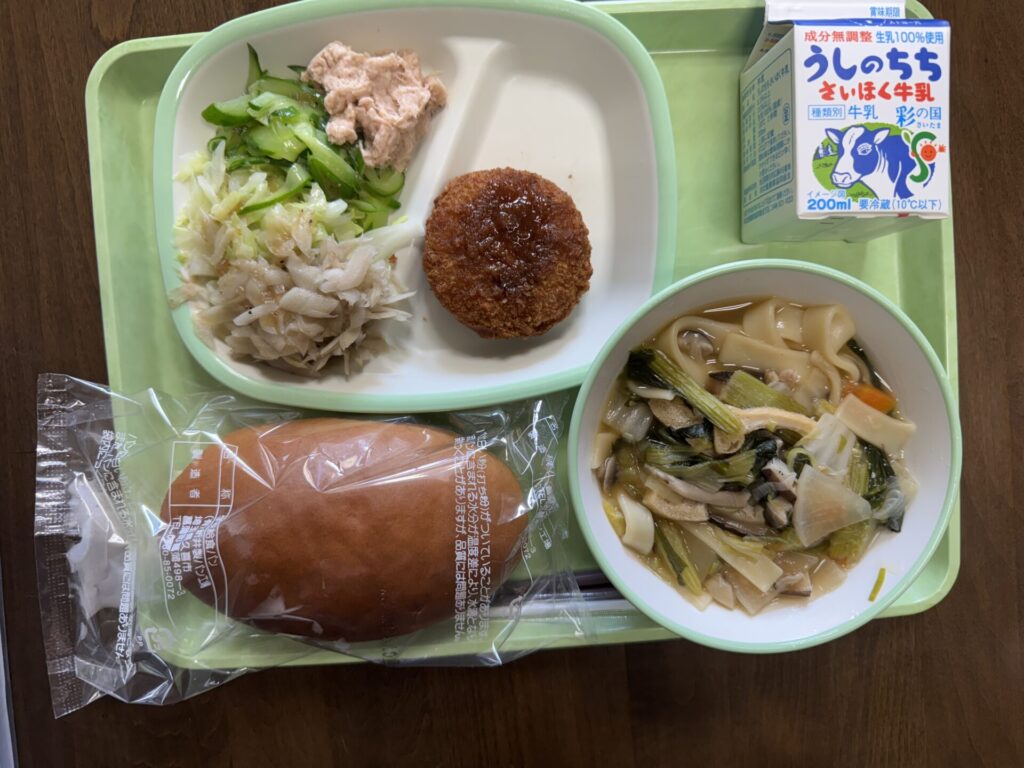 30日の給食 2025年10月30日 最終更新日時 : 2025年10月30日 kumagaya_edit 今日の給食は、黒パン、煮ぼうとう、カレーポテトコロッケ、ヘルシーサラダ、牛乳です。煮ぼうとうは、埼玉県や群馬県で食べられている郷土料理です。自校式なので、めんは、こしがあって、もっちりしていて、とてもおいしい仕上がりになっていました。