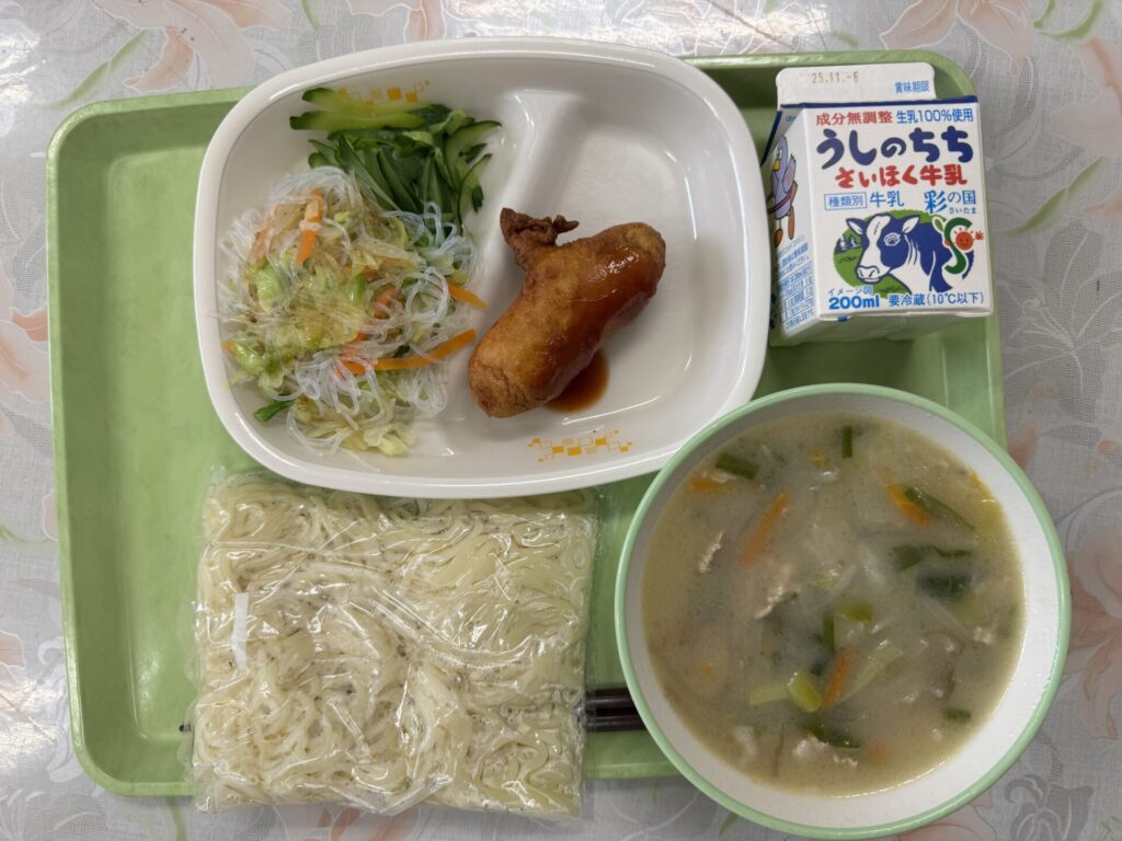 今日の給食は、ホット中華麺、白湯ラーメン、手作りアメリカンドッグ、春雨サラダ、牛乳です。鶏ガラや豚ガラを強火で長時間煮込んだスープです。字の通り、白いスープです。よくラーメンに使われています。白湯ラーメンは新メニューでした。いかがだったでしょうか?