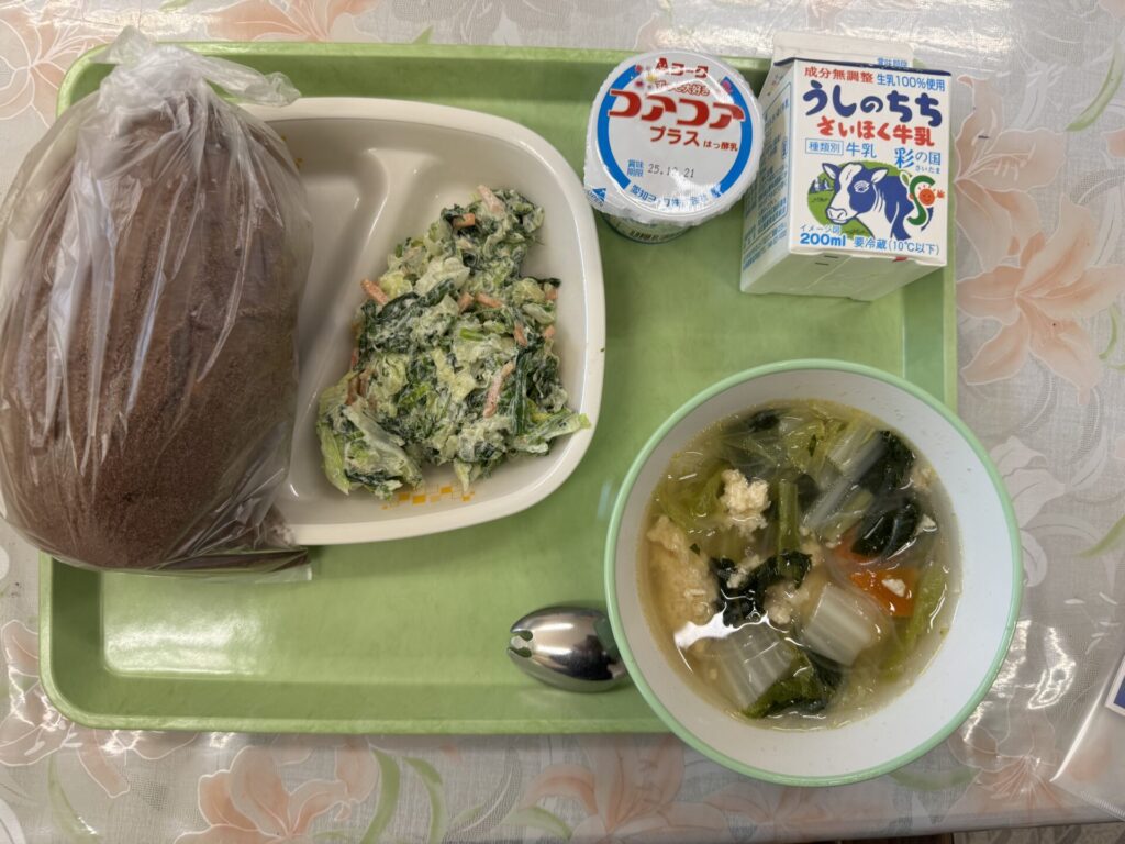 今日の給食は、ココア揚げパン、白菜と肉団子のスープ、ツナマヨサラダ、コアコアプラスヨーグルト、牛乳です。今日は月に一度の揚げパンの日です。今月はココア揚げパンです。ここでクイズです。ココアの日はいつか知っていますか。(10秒考える時間をとってください。)正解は、立冬の日です。2016年に森永製菓により制定されました。森永製菓は対象8年に日本ではじめてミルクココアを販売されたと言われています。「ココアはやっぱり森永♪」コマーシャルにも納得ですね。今年の冬至は12月22日です。ココアを飲んで過ごしてみてはいかがでしょうか。