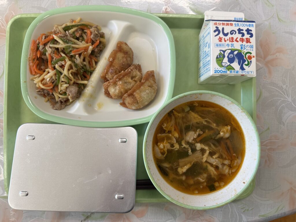 今日の給食は、ごはん、チンジャオロース、揚げ餃子、ユッケジャンスープ、牛乳です。今日はユッケジャンスープに入っている「ぜんまい」のお話です。ぜんまいは、山でとれる野菜です。山菜と言います。あくが強いので重曹などであく抜きをして食べます。ユッケジャンスープに入っている「ぜんまい」もあく抜きがされています。「ぜんまい」には、カロテン、ビタミン、鉄分、食物繊維などが豊富に含まれています。味わって食べてみてくださいね。