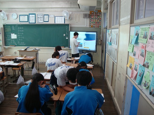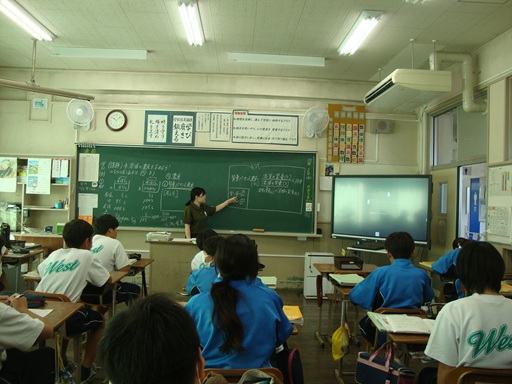 2年生は、数学の授業風景です。「一次関数」の授業です。自力解決で個人で解いたり、教え合いをおこなったり、デジタル教材を使ったり、多様な学びで問題を解決しています。