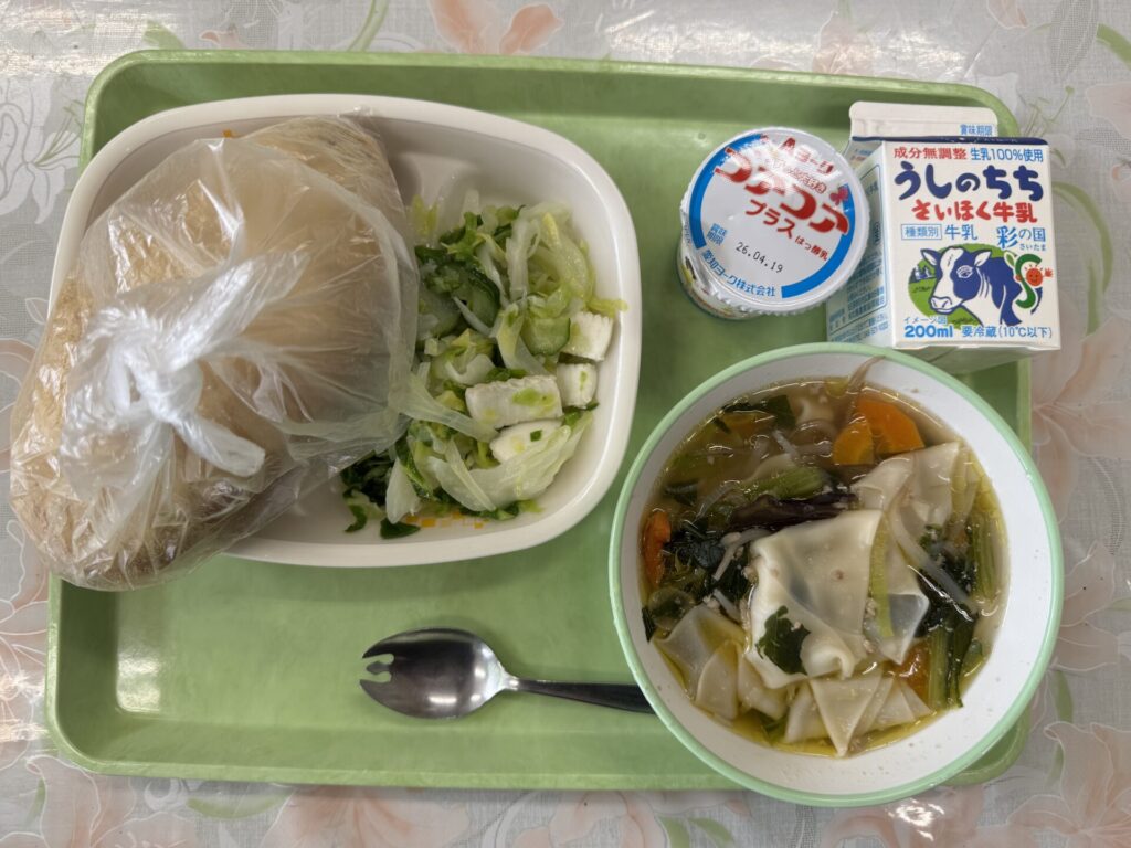 今日の給食は、きなこ揚げパン、ワンタンスープ、いかのマリネ、コアコアプラスヨーグルト、牛乳です。今日は、月に一度の揚げパンの日ですね。令和8年度の記念すべき1回目のメニューが大人気の揚げパンです!大人の人が好きだった給食のメニューとして揚げパンは必ずと言ってもいいほど登場します。揚げパンのパンは、コッペパンを油で揚げています。揚げ時間は、ごくわずかで、調理員さんがパンの状態を見極めて油からパンを取り出します。そしてきな粉をまぶすにもコツがあるそうです。まさに職人技ですね。味わって食べてくださいね。