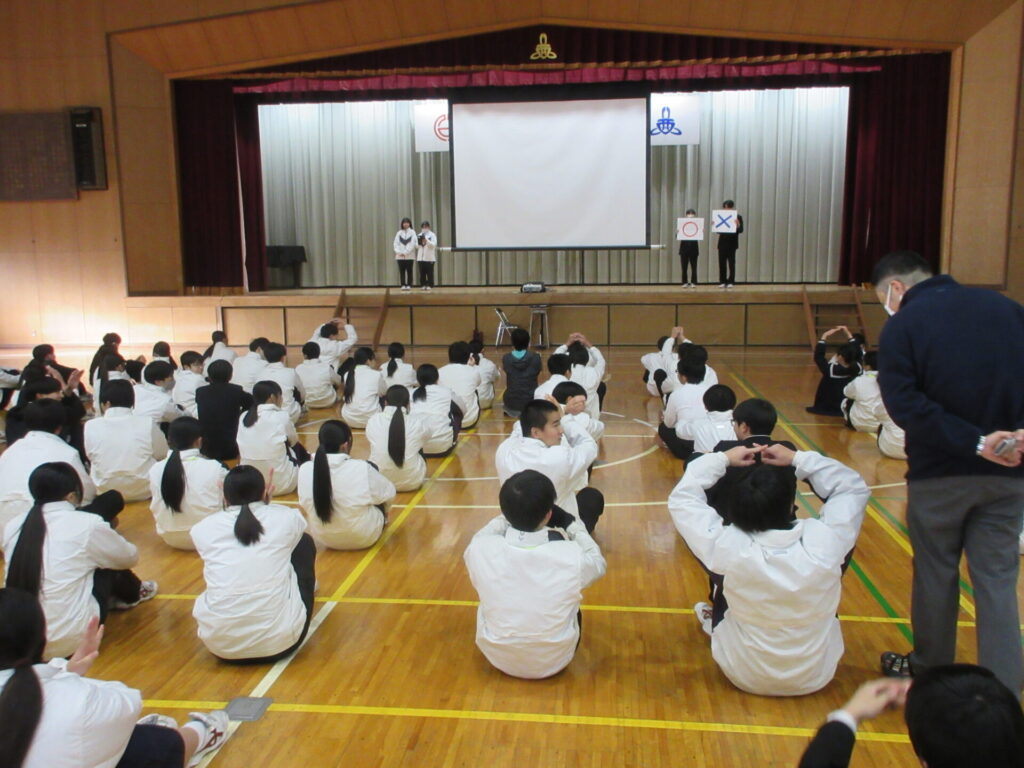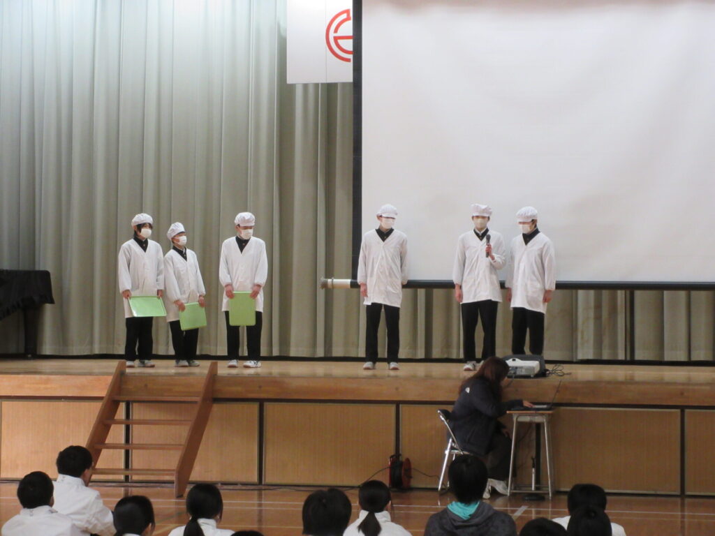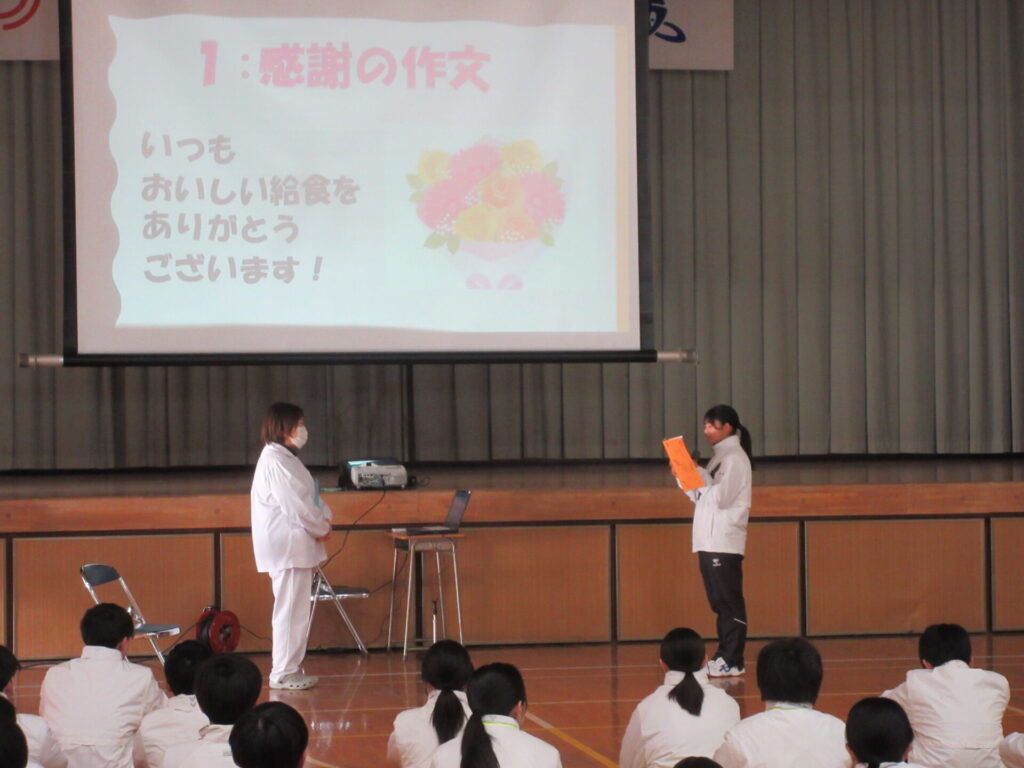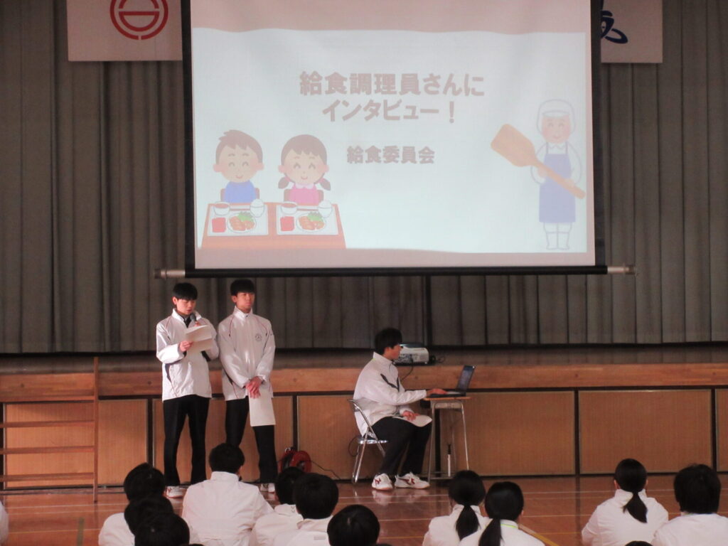 1月21日、生徒朝会が行われました。給食委員会が発表をしました。